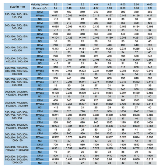 - Volume flow rate range 200 – 1400 CFM Or 0.0944 – 0.06607 m³/sec.